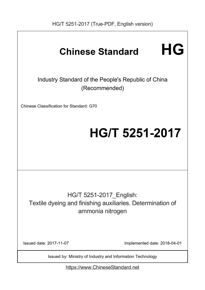 Delivery: <= 3 days. True-PDF full-copy in English will be manually translated and delivered via email. HG/T 5251-2017: Textile dyeing and finishing auxiliaries. Determination of ammonia nitrogen Status: Valid