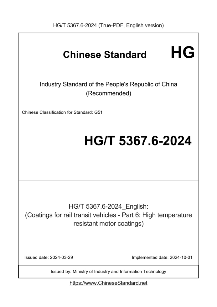 Delivery: <= 3 days. True-PDF full-copy in English will be manually translated and delivered via email. HG/T 5367.6-2024: (Coatings for rail transit vehicles - Part 6: High temperature resistant motor coatings) Status: Valid