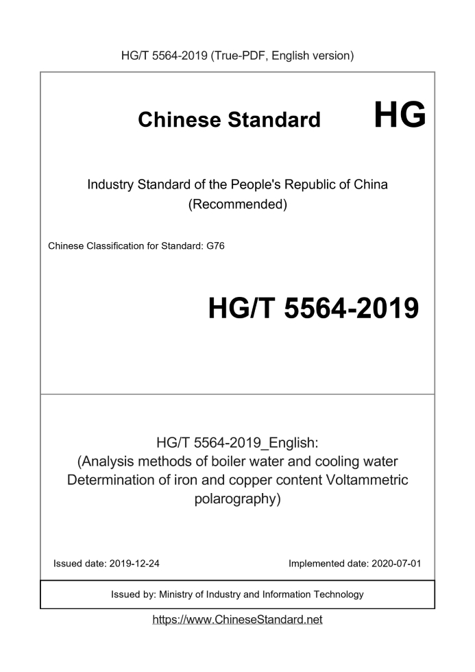 Delivery: <= 3 days. True-PDF full-copy in English will be manually translated and delivered via email. HG/T 5564-2019: (Analysis methods of boiler water and cooling water Determination of iron and copper content Voltammetric polarography) Status: Valid
