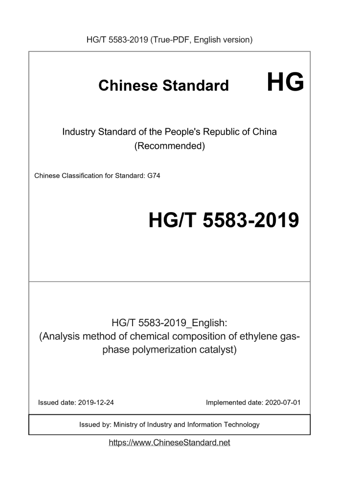Delivery: <= 3 days. True-PDF full-copy in English will be manually translated and delivered via email. HG/T 5583-2019: (Analysis method of chemical composition of ethylene gas-phase polymerization catalyst) Status: Valid