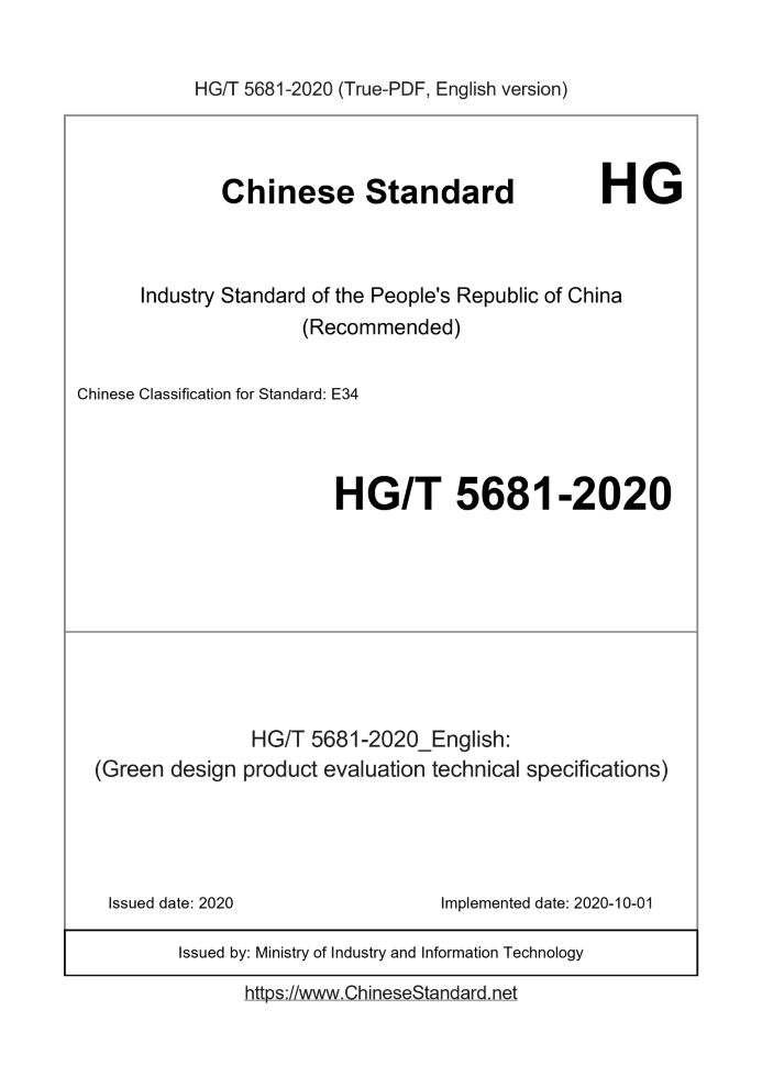 Delivery: <= 4 days. True-PDF full-copy in English will be manually translated and delivered via email. HG/T 5681-2020: (Green design product evaluation technical specifications) Status: Valid