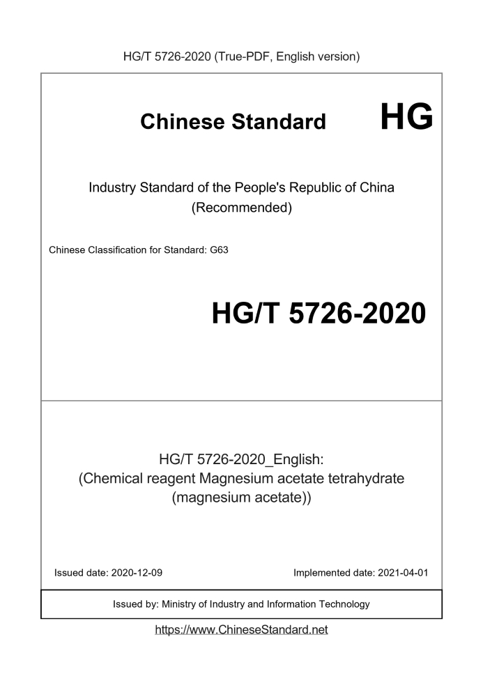 Delivery: <= 3 days. True-PDF full-copy in English will be manually translated and delivered via email. HG/T 5726-2020: (Chemical reagent Magnesium acetate tetrahydrate (magnesium acetate)) Status: Valid