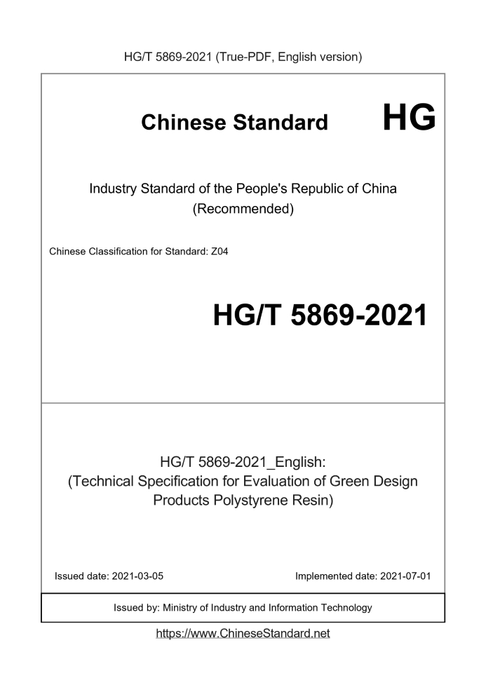 Delivery: <= 4 days. True-PDF full-copy in English will be manually translated and delivered via email. HG/T 5869-2021: (Technical Specification for Evaluation of Green Design Products Polystyrene Resin) Status: Valid