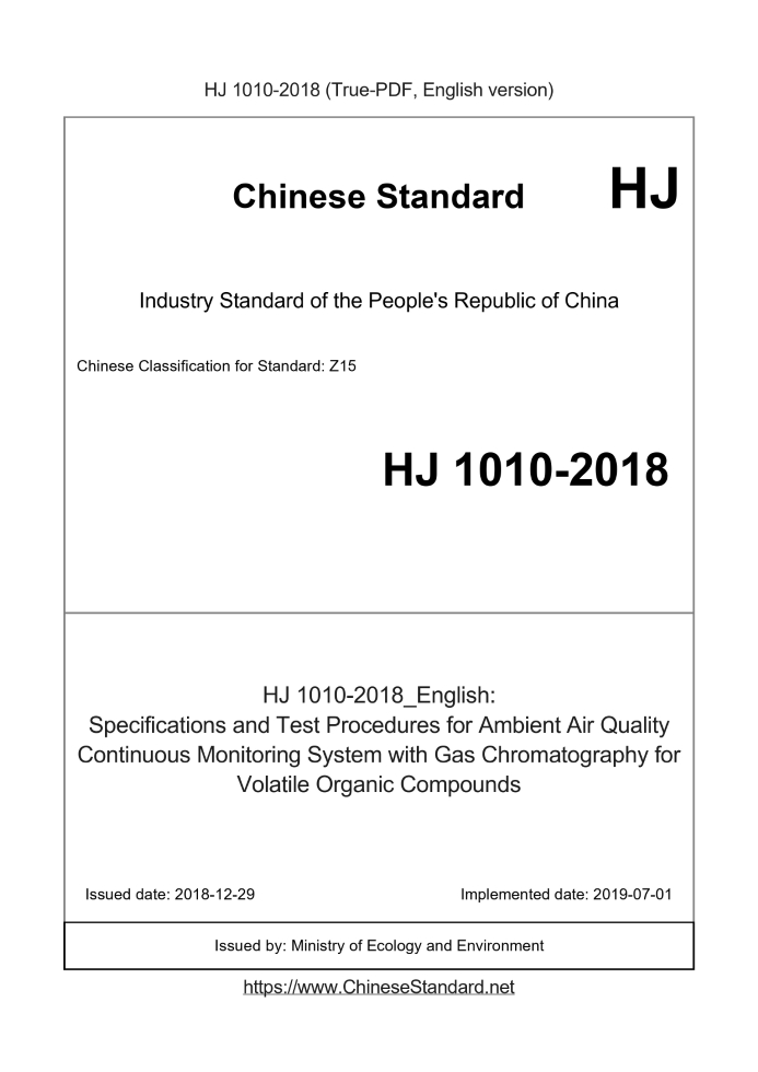 Delivery: <= 4 days. True-PDF full-copy in English will be manually translated and delivered via email. HJ 1010-2018: Specifications and Test Procedures for Ambient Air Quality Continuous Monitoring System with Gas Chromatography for Volatile Organic Compounds Status: Valid