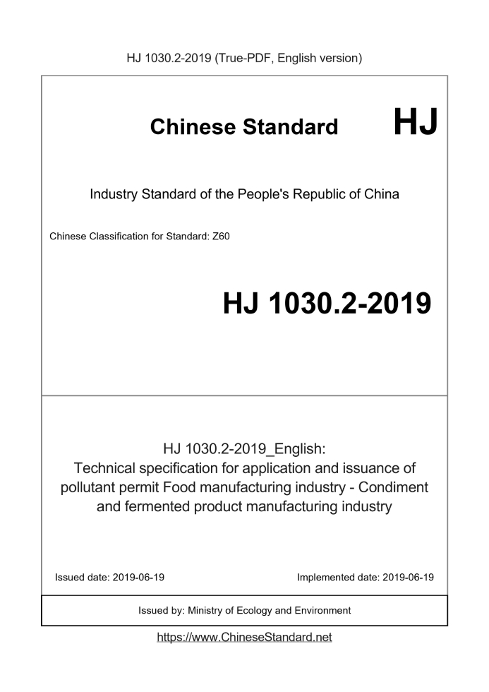 Delivery: <= 7 days. True-PDF full-copy in English will be manually translated and delivered via email. HJ 1030.2-2019: Technical specification for application and issuance of pollutant permit Food manufacturing industry - Condiment and fermented product manufacturing industry Status: Valid