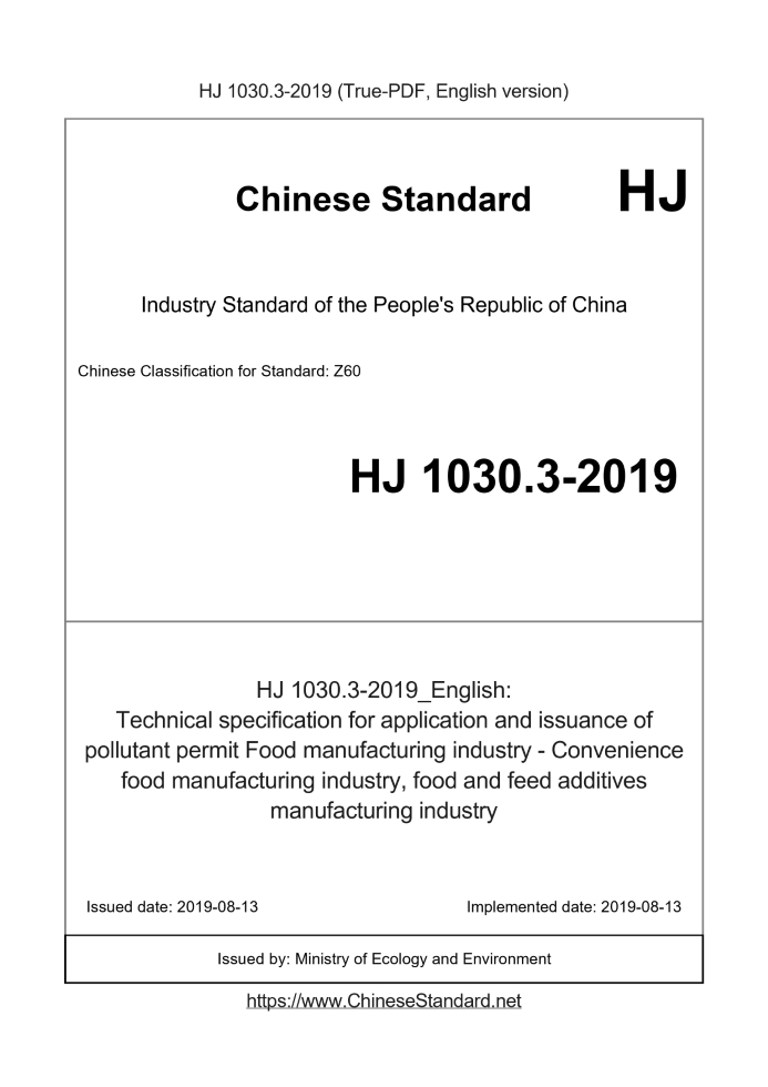 Delivery: <= 7 days. True-PDF full-copy in English will be manually translated and delivered via email. HJ 1030.3-2019: Technical specification for application and issuance of pollutant permit Food manufacturing industry - Convenience food manufacturing industry, food and feed additives manufacturing industry Status: Valid