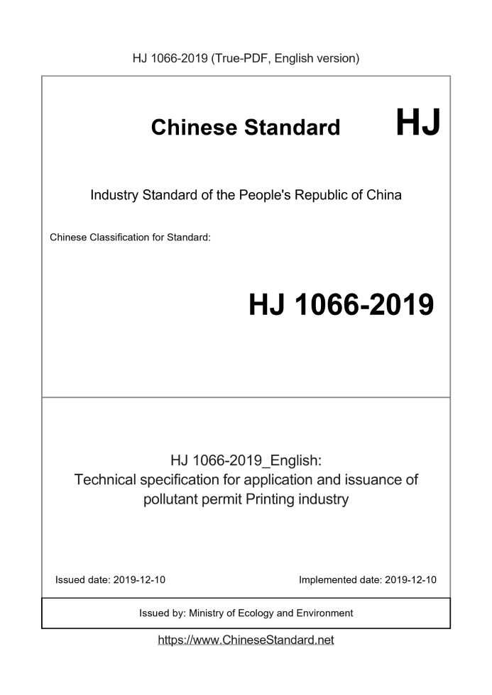 Delivery: <= 8 days. True-PDF full-copy in English will be manually translated and delivered via email. HJ 1066-2019: Technical specification for application and issuance of pollutant permit Printing industry Status: Valid