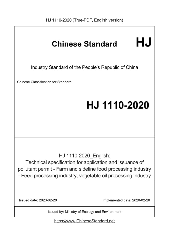 Delivery: <= 6 days. True-PDF full-copy in English will be manually translated and delivered via email. HJ 1110-2020: Technical specification for application and issuance of pollutant permit - Farm and sideline food processing industry - Feed processing industry, vegetable oil processing industry Status: Valid
