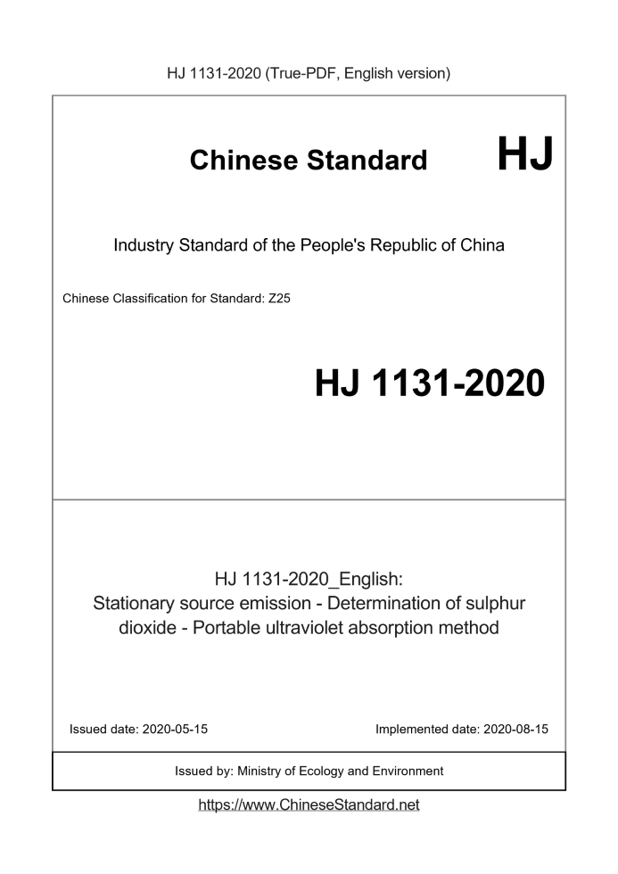 Delivery: <= 3 days. True-PDF full-copy in English will be manually translated and delivered via email. HJ 1131-2020: Stationary source emission - Determination of sulphur dioxide - Portable ultraviolet absorption method Status: Valid