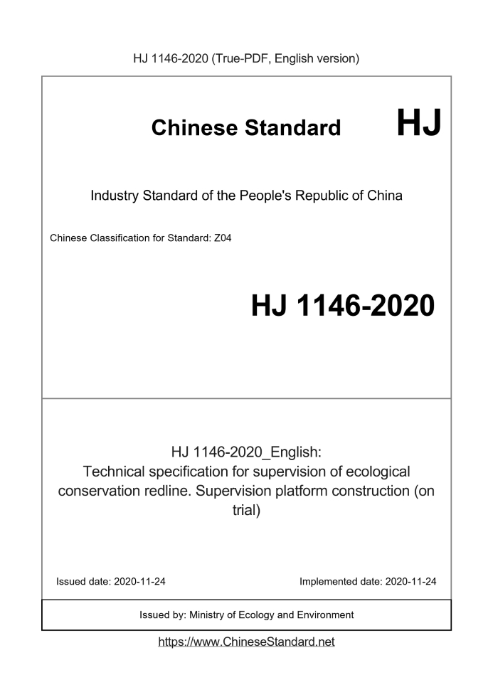 Delivery: <= 3 days. True-PDF full-copy in English will be manually translated and delivered via email. HJ 1146-2020: Technical specification for supervision of ecological conservation redline. Supervision platform construction (on trial) Status: Valid