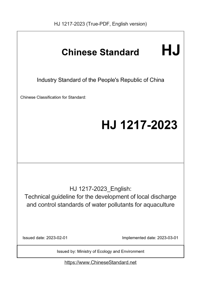 Delivery: <= 3 days. True-PDF full-copy in English will be manually translated and delivered via email. HJ 1217-2023: Technical guideline for the development of local discharge and control standards of water pollutants for aquaculture Status: Valid