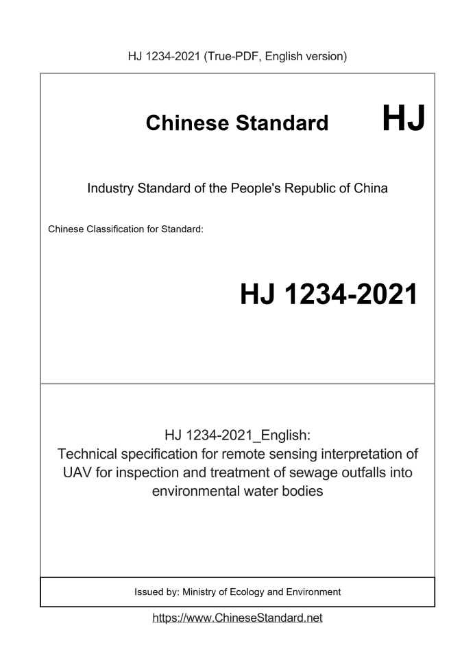 Delivery: <= 3 days. True-PDF full-copy in English will be manually translated and delivered via email. HJ 1234-2021: Technical specification for remote sensing interpretation of UAV for inspection and treatment of sewage outfalls into environmental water bodies Status: Valid
