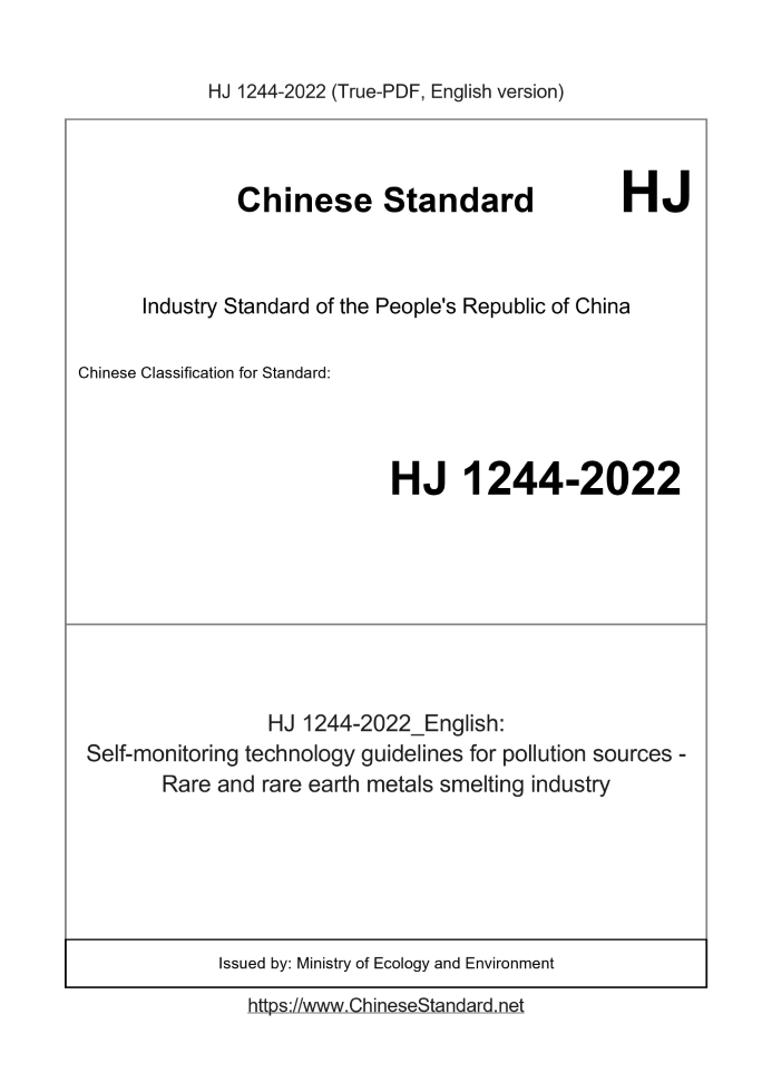 Delivery: <= 3 days. True-PDF full-copy in English will be manually translated and delivered via email. HJ 1244-2022: Self-monitoring technology guidelines for pollution sources - Rare and rare earth metals smelting industry Status: Valid