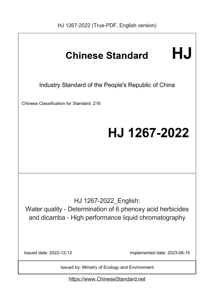 Delivery: <= 4 days. True-PDF full-copy in English will be manually translated and delivered via email. HJ 1267-2022: Water quality - Determination of 6 phenoxy acid herbicides and dicamba - High performance liquid chromatography Status: Valid