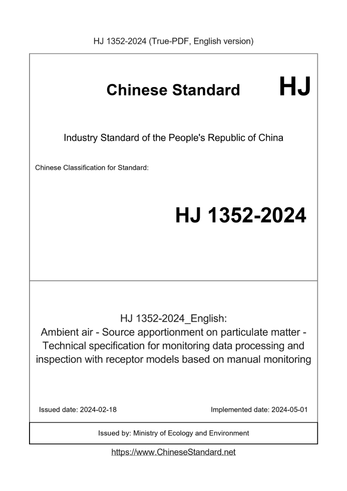 Delivery: <= 3 days. True-PDF full-copy in English will be manually translated and delivered via email. HJ 1352-2024: Ambient air - Source apportionment on particulate matter - Technical specification for monitoring data processing and inspection with receptor models based on manual monitoring Status: Valid