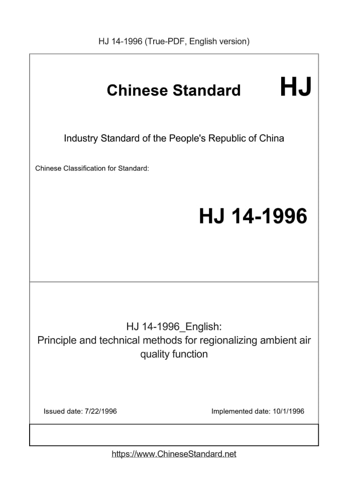 Delivery: <= 3 days. True-PDF full-copy in English will be manually translated and delivered via email. HJ 14-1996: Principle and technical methods for regionalizing ambient air quality function