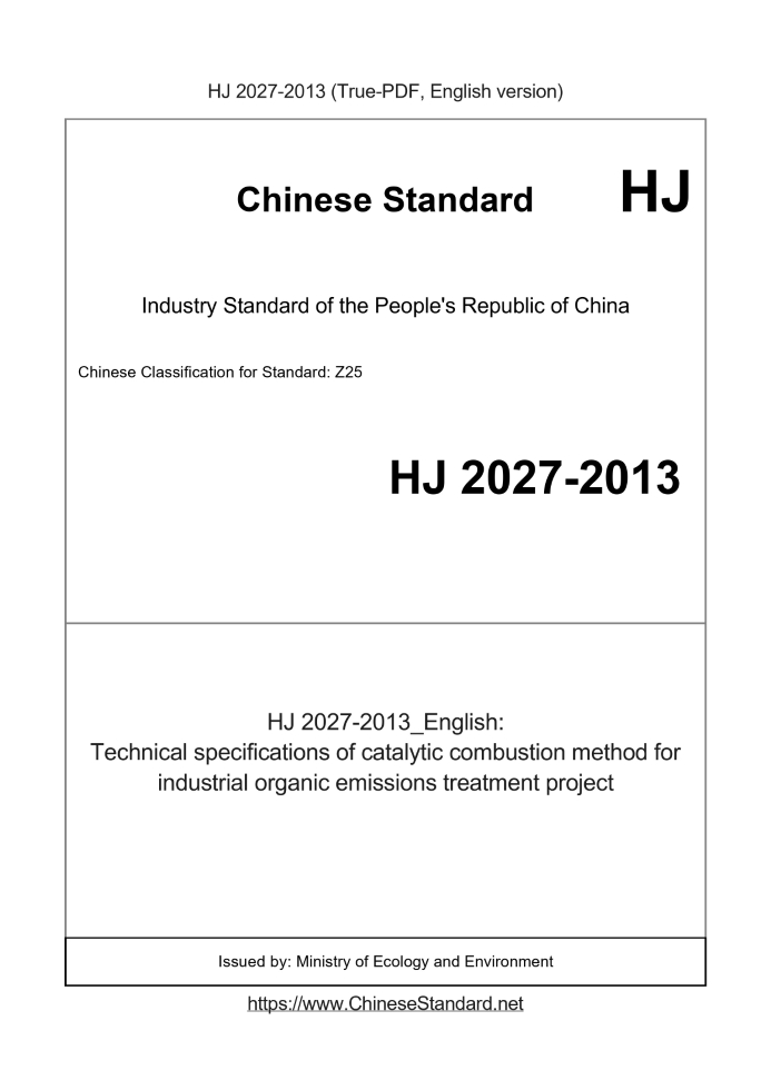 Delivery: <= 3 days. True-PDF full-copy in English will be manually translated and delivered via email. HJ 2027-2013: Technical specifications of catalytic combustion method for industrial organic emissions treatment project Status: Valid
