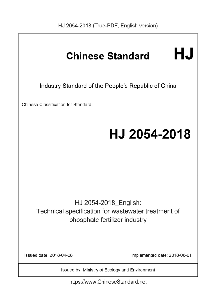 Delivery: <= 4 days. True-PDF full-copy in English will be manually translated and delivered via email. HJ 2054-2018: Technical specification for wastewater treatment of phosphate fertilizer industry Status: Valid