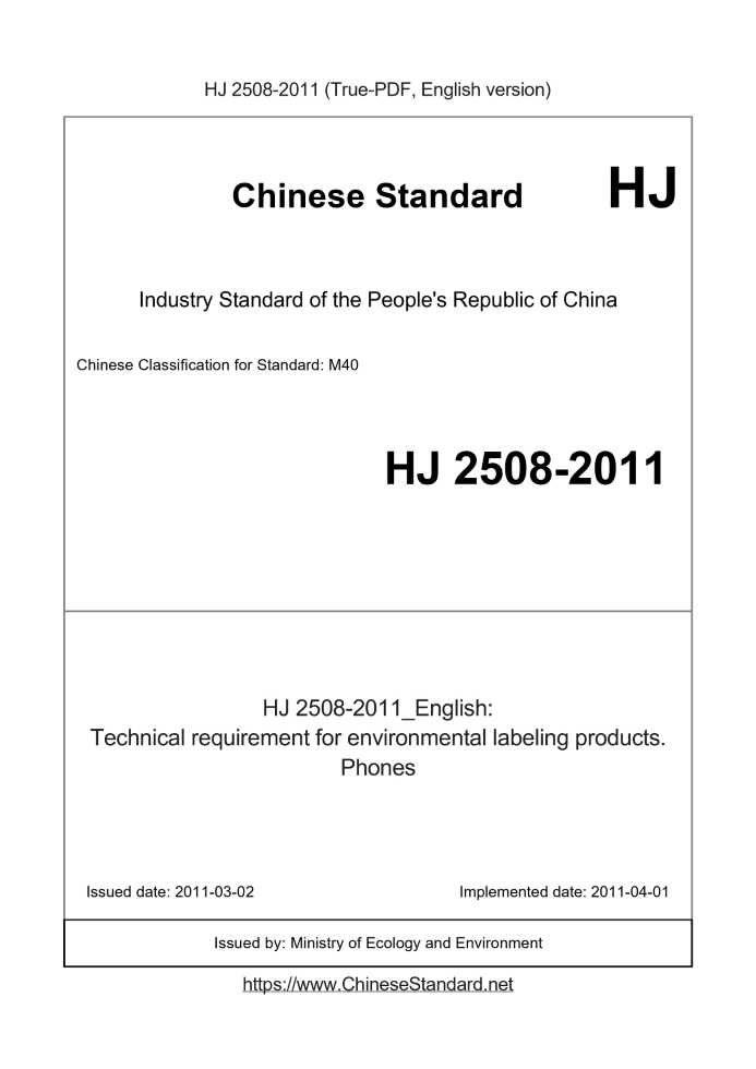 Delivery: <= 3 days. True-PDF full-copy in English will be manually translated and delivered via email. HJ 2508-2011: Technical requirement for environmental labeling products. Phones Status: Valid