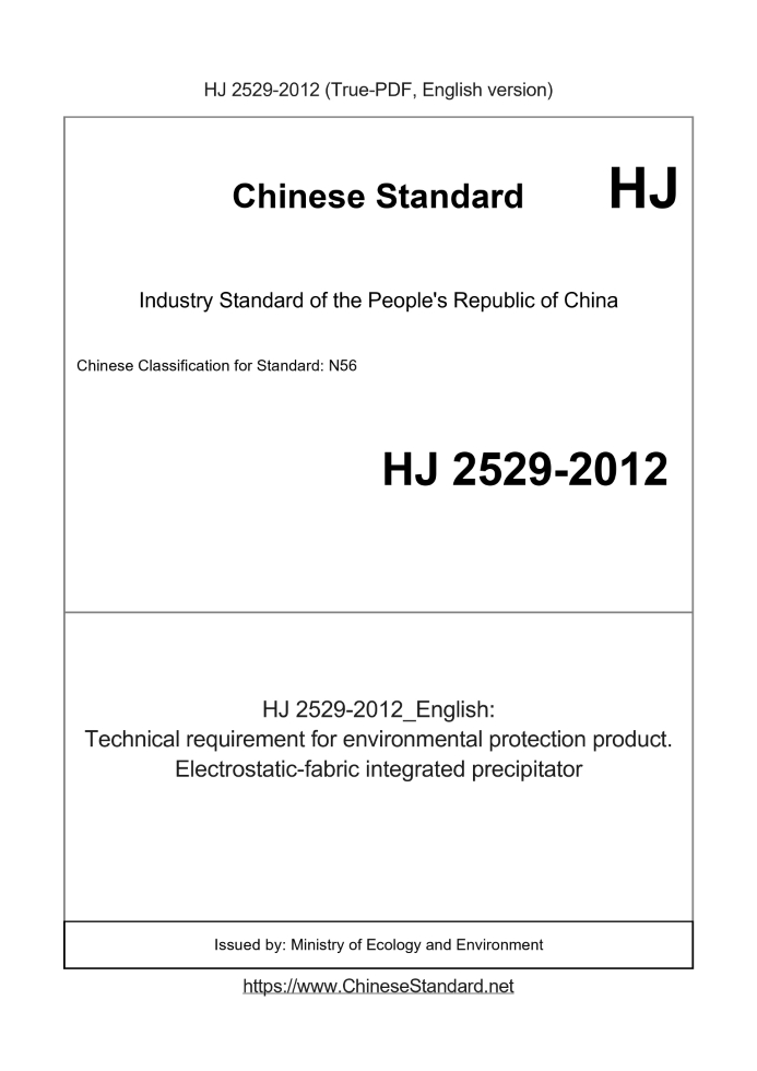 Delivery: <= 3 days. True-PDF full-copy in English will be manually translated and delivered via email. HJ 2529-2012: Technical requirement for environmental protection product. Electrostatic-fabric integrated precipitator Status: Valid