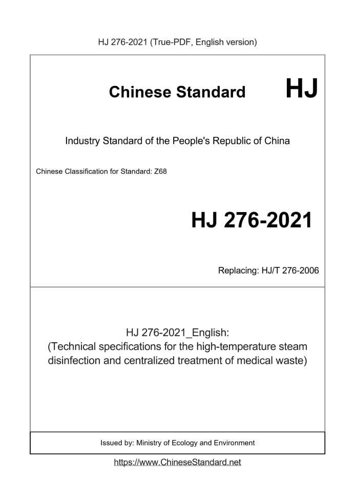 Delivery: <= 5 days. True-PDF full-copy in English will be manually translated and delivered via email. HJ 276-2021: (Technical specifications for the high-temperature steam disinfection and centralized treatment of medical waste) Status: Valid HJ 276: Historical versions