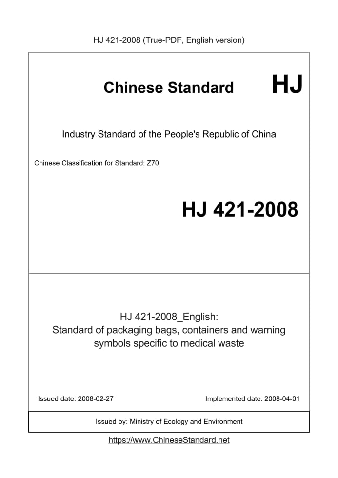 Delivery: <= 3 days. True-PDF full-copy in English will be manually translated and delivered via email. HJ 421-2008: Standard of packaging bags, containers and warning symbols specific to medical waste Status: Valid