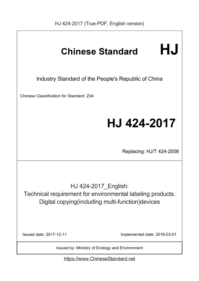 Delivery: <= 4 days. True-PDF full-copy in English will be manually translated and delivered via email. HJ 424-2017: Technical requirement for environmental labeling products. Digital copying(including multi-function)devices Status: Valid HJ 424: Historical versions