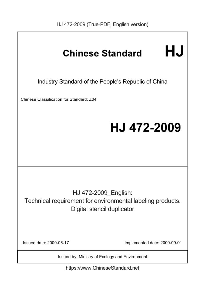 Delivery: <= 6 days. True-PDF full-copy in English will be manually translated and delivered via email. HJ 472-2009: Technical requirement for environmental labeling products. Digital stencil duplicator Status: Valid