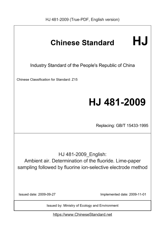Delivery: <= 3 days. True-PDF full-copy in English will be manually translated and delivered via email. HJ 481-2009: Ambient air. Determination of the fluoride. Lime-paper sampling followed by fluorine ion-selective electrode method Status: Valid
