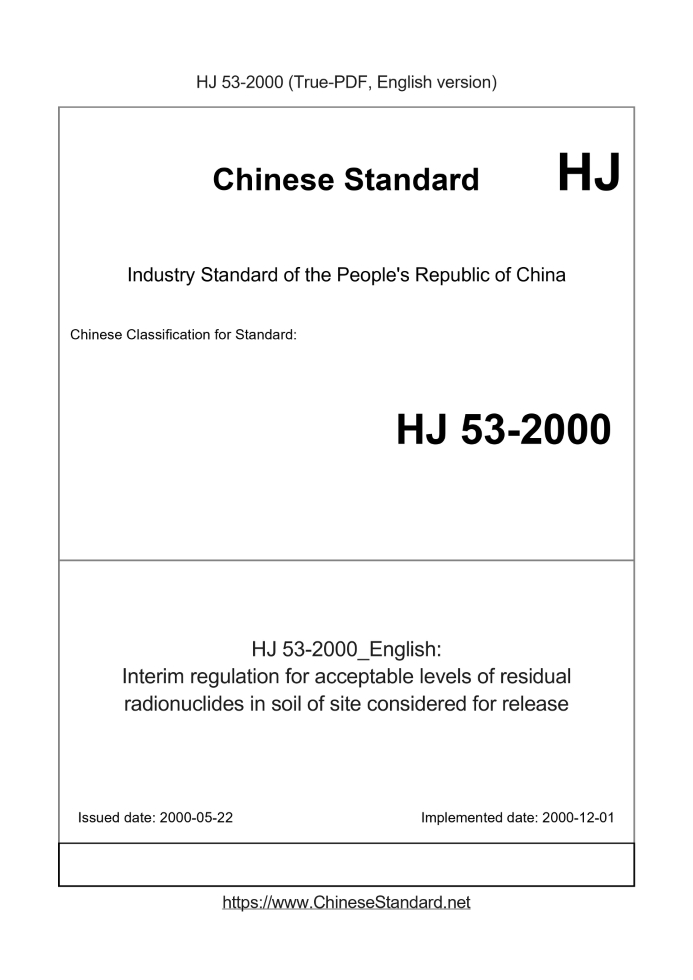 Delivery: <= 3 days. True-PDF full-copy in English will be manually translated and delivered via email. HJ 53-2000: Interim regulation for acceptable levels of residual radionuclides in soil of site considered for release