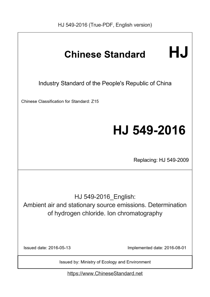 Delivery: <= 3 days. True-PDF full-copy in English will be manually translated and delivered via email. HJ 549-2016: Ambient air and stationary source emissions. Determination of hydrogen chloride. Ion chromatography Status: Valid HJ 549: Historical versions