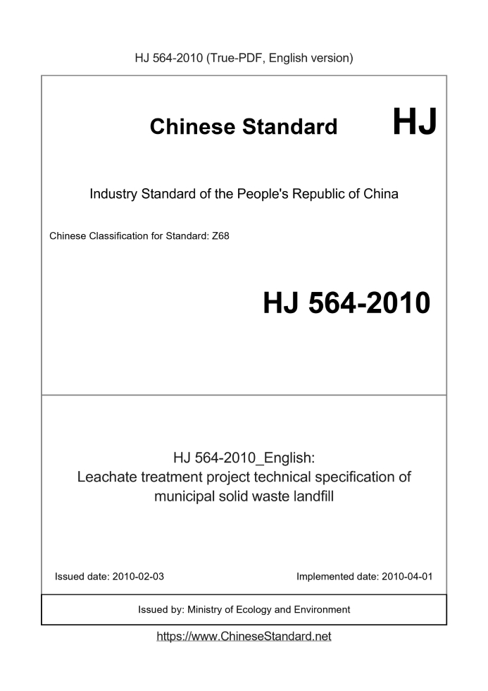 Delivery: <= 3 days. True-PDF full-copy in English will be manually translated and delivered via email. HJ 564-2010: Leachate treatment project technical specification of municipal solid waste landfill Status: Valid