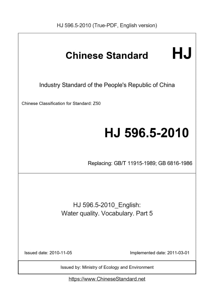 Delivery: <= 3 days. True-PDF full-copy in English will be manually translated and delivered via email. HJ 596.5-2010: Water quality. Vocabulary. Part 5 Status: Valid