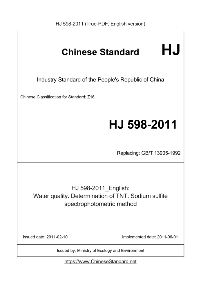 Delivery: <= 3 days. True-PDF full-copy in English will be manually translated and delivered via email. HJ 598-2011: Water quality. Determination of TNT. Sodium sulfite spectrophotometric method Status: Valid
