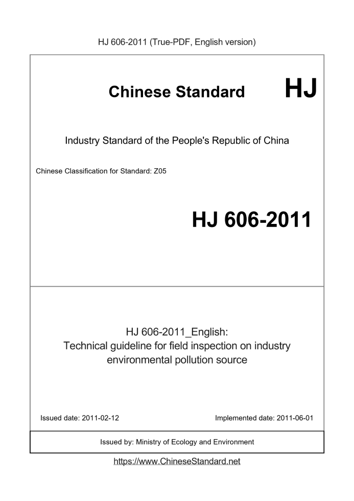 Delivery: <= 3 days. True-PDF full-copy in English will be manually translated and delivered via email. HJ 606-2011: Technical guideline for field inspection on industry environmental pollution source Status: Valid