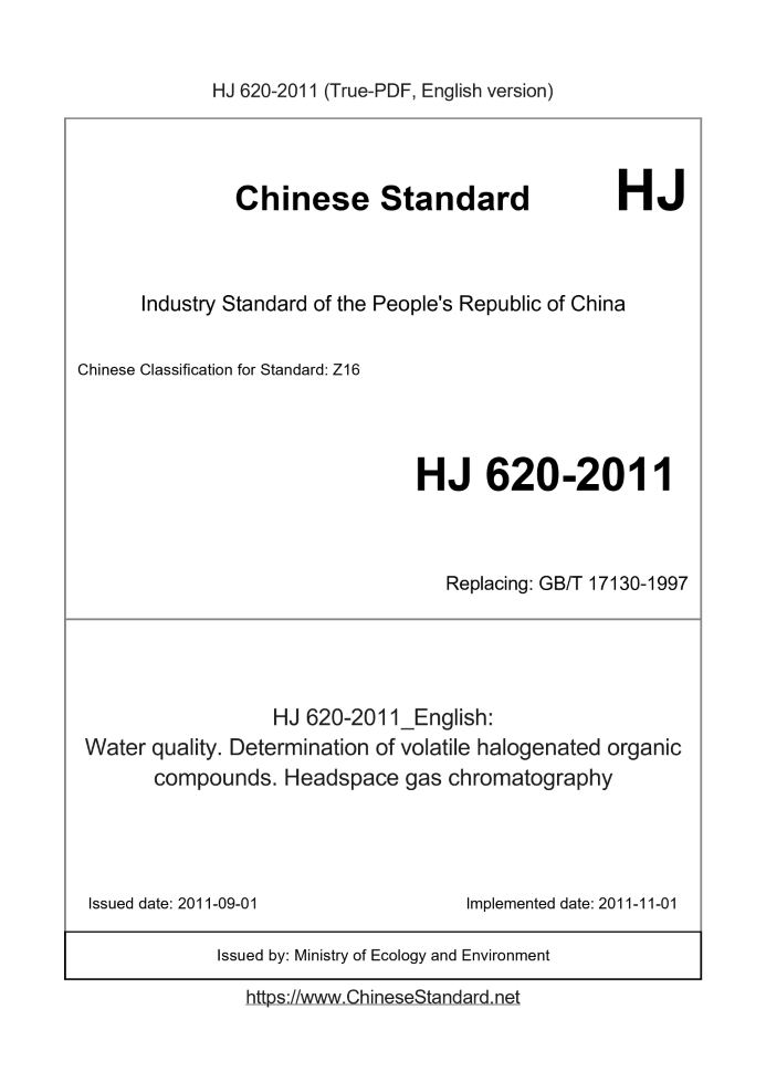 Delivery: <= 3 days. True-PDF full-copy in English will be manually translated and delivered via email. HJ 620-2011: Water quality. Determination of volatile halogenated organic compounds. Headspace gas chromatography Status: Valid