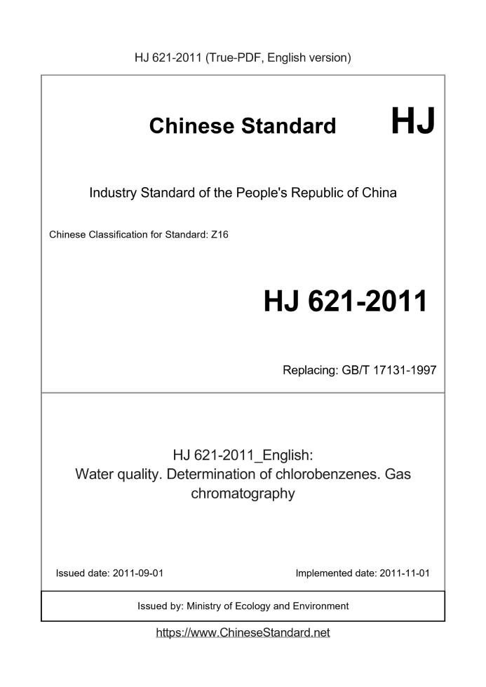 Delivery: <= 3 days. True-PDF full-copy in English will be manually translated and delivered via email. HJ 621-2011: Water quality. Determination of chlorobenzenes. Gas chromatography Status: Valid