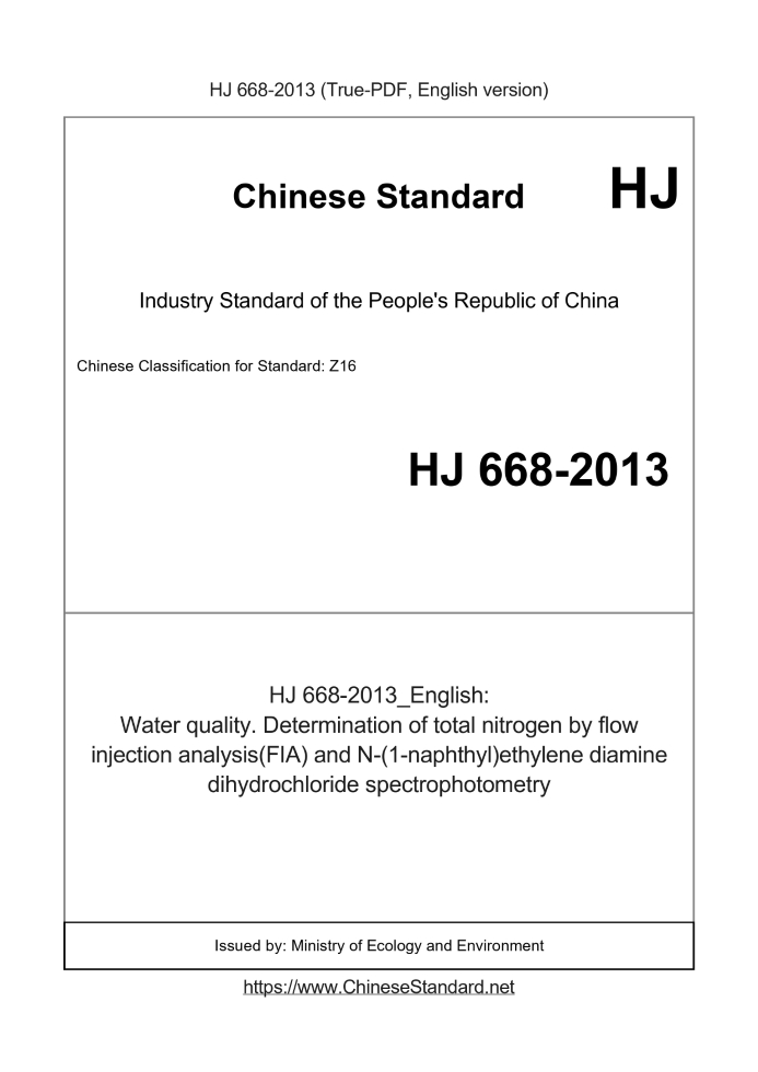 Delivery: <= 3 days. True-PDF full-copy in English will be manually translated and delivered via email. HJ 668-2013: Water quality. Determination of total nitrogen by flow injection analysis(FIA) and N-(1-naphthyl)ethylene diamine dihydrochloride spectrophotometry Status: Valid
