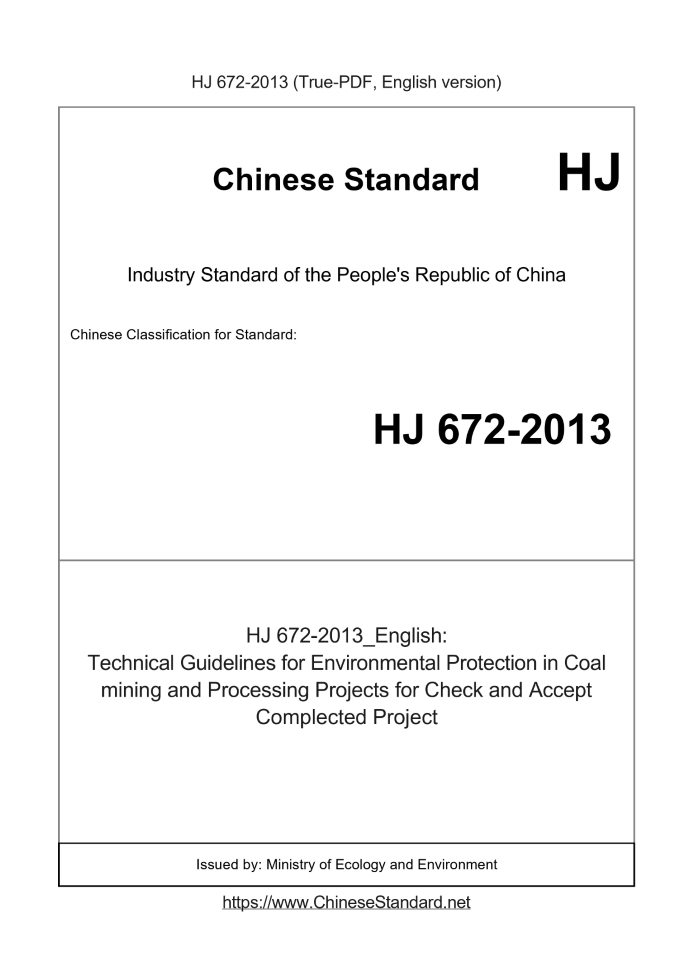 Delivery: <= 5 days. True-PDF full-copy in English will be manually translated and delivered via email. HJ 672-2013: Technical Guidelines for Environmental Protection in Coal mining and Processing Projects for Check and Accept Complected Project Status: Valid