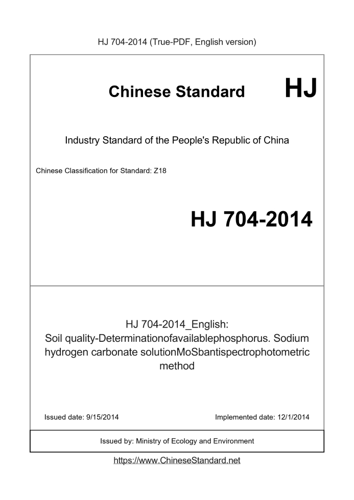 Delivery: <= 3 days. True-PDF full-copy in English will be manually translated and delivered via email. HJ 704-2014: Soil quality-Determinationofavailablephosphorus. Sodium hydrogen carbonate solutionMoSbantispectrophotometric method Status: Valid