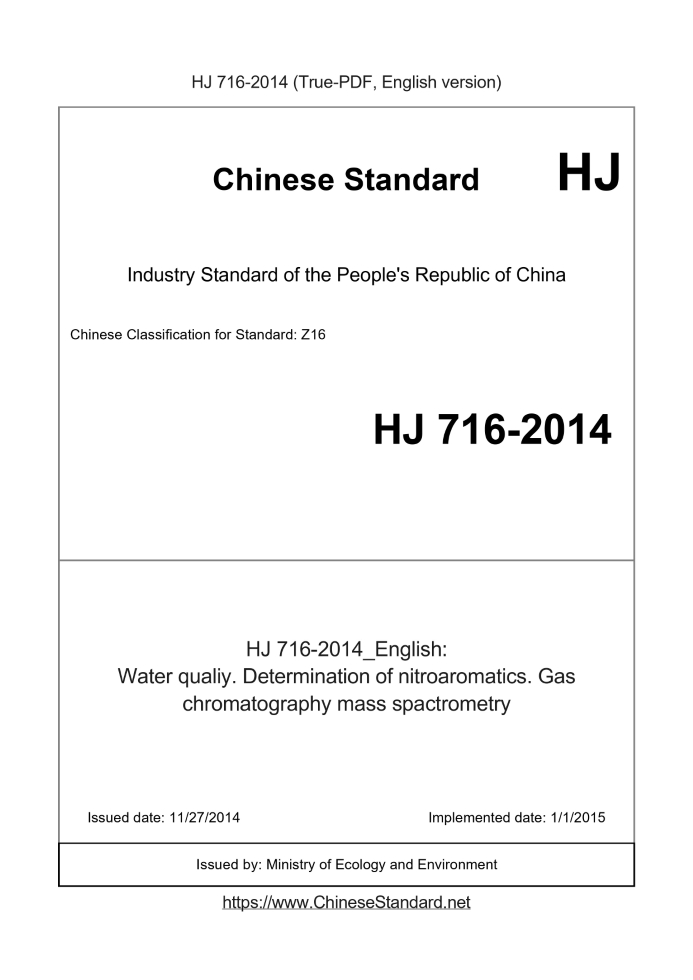 Delivery: <= 4 days. True-PDF full-copy in English will be manually translated and delivered via email. HJ 716-2014: Water qualiy. Determination of nitroaromatics. Gas chromatography mass spactrometry Status: Valid