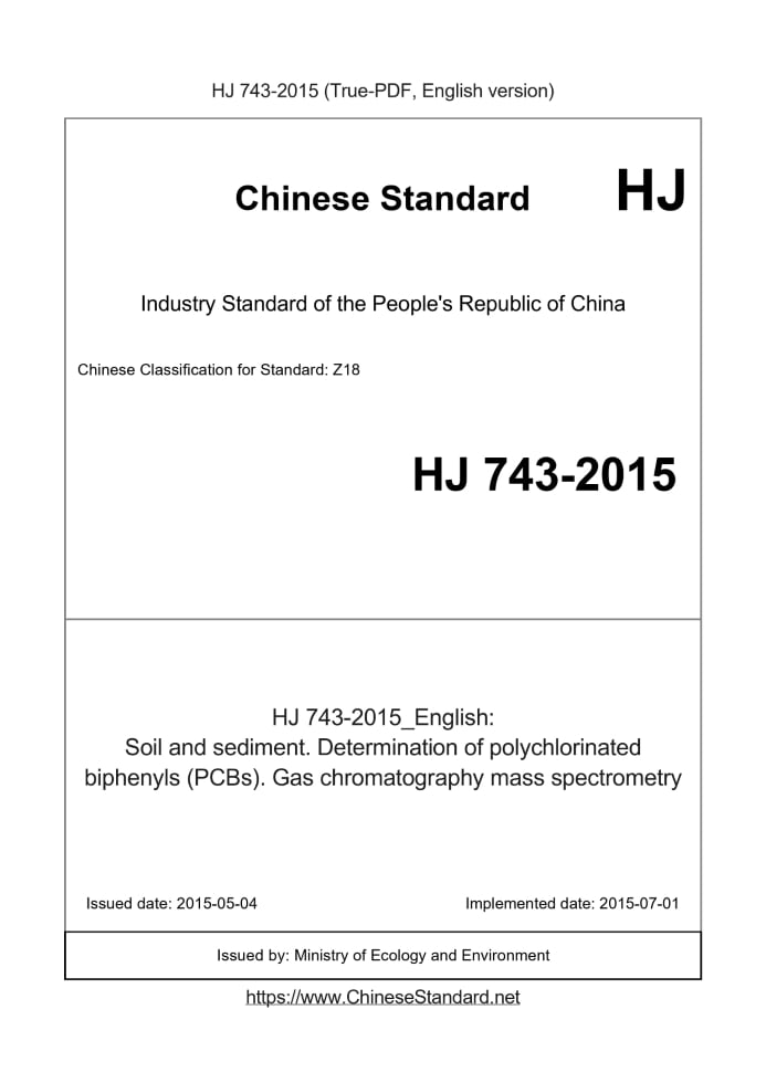 Delivery: <= 4 days. True-PDF full-copy in English will be manually translated and delivered via email. HJ 743-2015: Soil and sediment. Determination of polychlorinated biphenyls (PCBs). Gas chromatography mass spectrometry Status: Valid