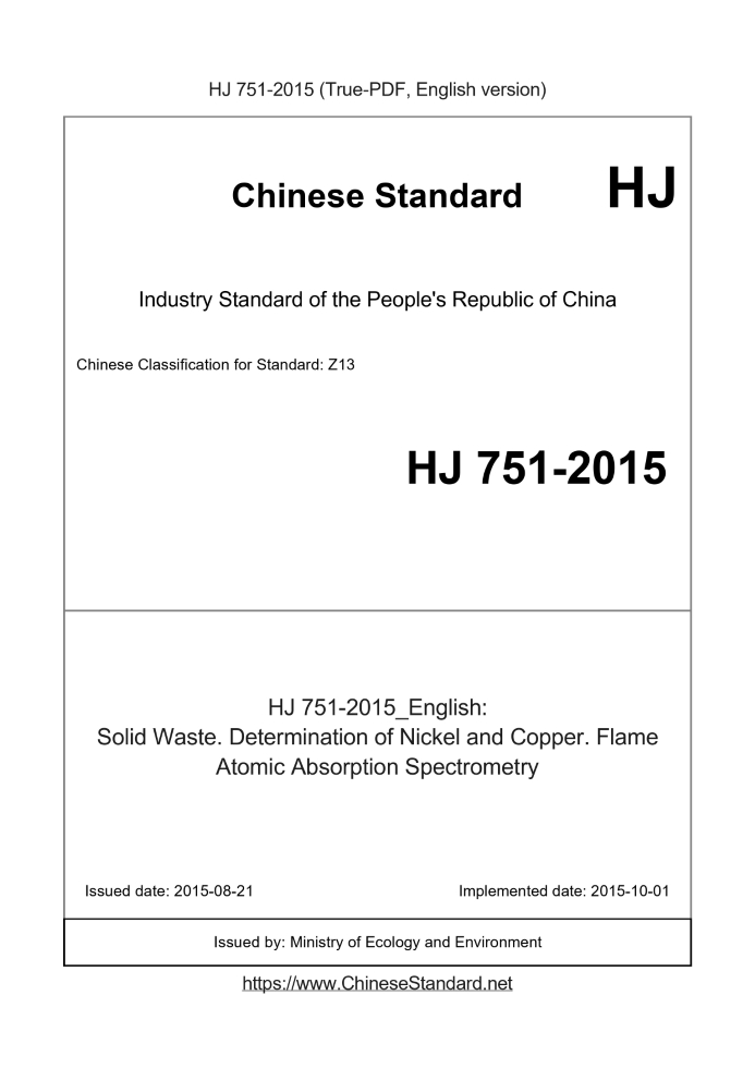 Delivery: <= 3 days. True-PDF full-copy in English will be manually translated and delivered via email. HJ 751-2015: Solid Waste. Determination of Nickel and Copper. Flame Atomic Absorption Spectrometry Status: Valid