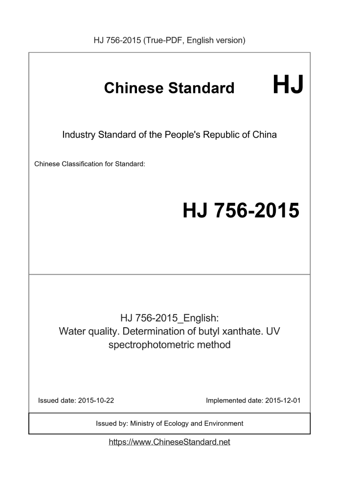 Delivery: <= 3 days. True-PDF full-copy in English will be manually translated and delivered via email. HJ 756-2015: Water quality. Determination of butyl xanthate. UV spectrophotometric method Status: Valid