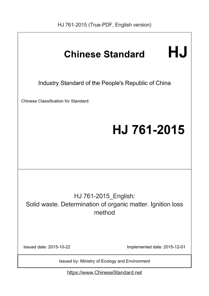 Delivery: <= 3 days. True-PDF full-copy in English will be manually translated and delivered via email. HJ 761-2015: Solid waste. Determination of organic matter. Ignition loss method Status: Valid