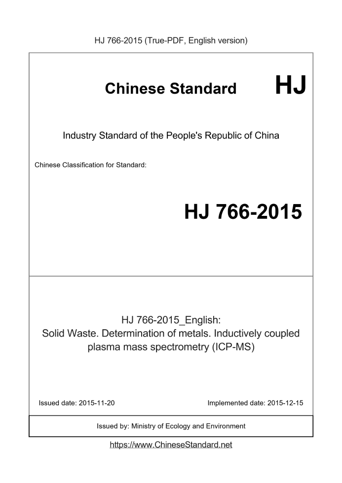 HJ 766-2015: Solid Waste. Determination of metals. Inductively coupled plasma mass spectrometry (ICP-MS)