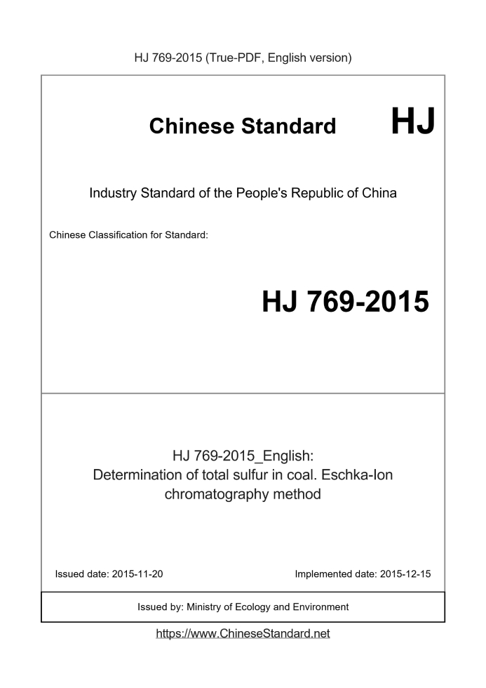 Delivery: <= 3 days. True-PDF full-copy in English will be manually translated and delivered via email. HJ 769-2015: Determination of total sulfur in coal. Eschka-Ion chromatography method Status: Valid