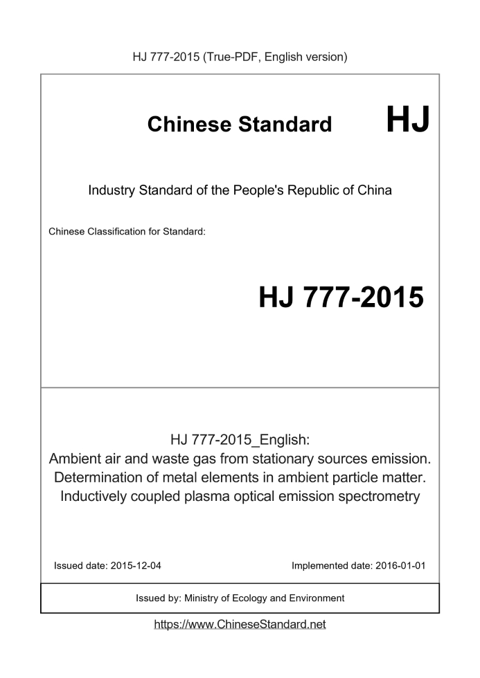 Delivery: <= 4 days. True-PDF full-copy in English will be manually translated and delivered via email. HJ 777-2015: Ambient air and waste gas from stationary sources emission. Determination of metal elements in ambient particle matter. Inductively coupled plasma optical emission spectrometry Status: Valid
