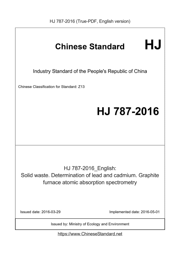 Delivery: <= 3 days. True-PDF full-copy in English will be manually translated and delivered via email. HJ 787-2016: Solid waste. Determination of lead and cadmium. Graphite furnace atomic absorption spectrometry Status: Valid