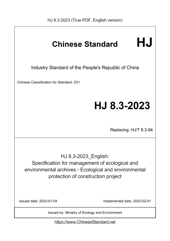 Delivery: <= 4 days. True-PDF full-copy in English will be manually translated and delivered via email. HJ 8.3-2023: Specification for management of ecological and environmental archives - Ecological and environmental protection of construction project Status: Valid HJ 8.3: Historical versions